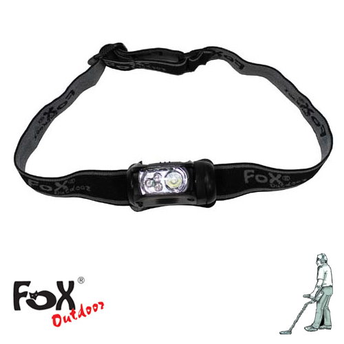 Leichte Stirnlampe für die Schatzsuche mit einem Metalldetektor bei Dunkelheit. Rotes blendarmes Licht. Die Lampe kann mit preiswerten Batterien aus dem Discounter betrieben werden.