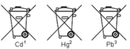 Batterien und Akkus, die potenziell Schadstoffe enthalten, sind mit einem Zeichen, bestehend aus einer durchgestrichenen Mülltonne und dem chemischen Symbol (Cd, Hg oder Pb) des für die Einstufung